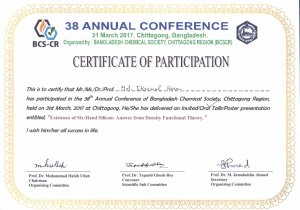 I presented my theoretical research on “Existence of Six Hand Silicon: Answer from Density Functional Theory” at 38th Conference of Bangladesh Chemical Society. I was awarded best presenter award at the conference.
