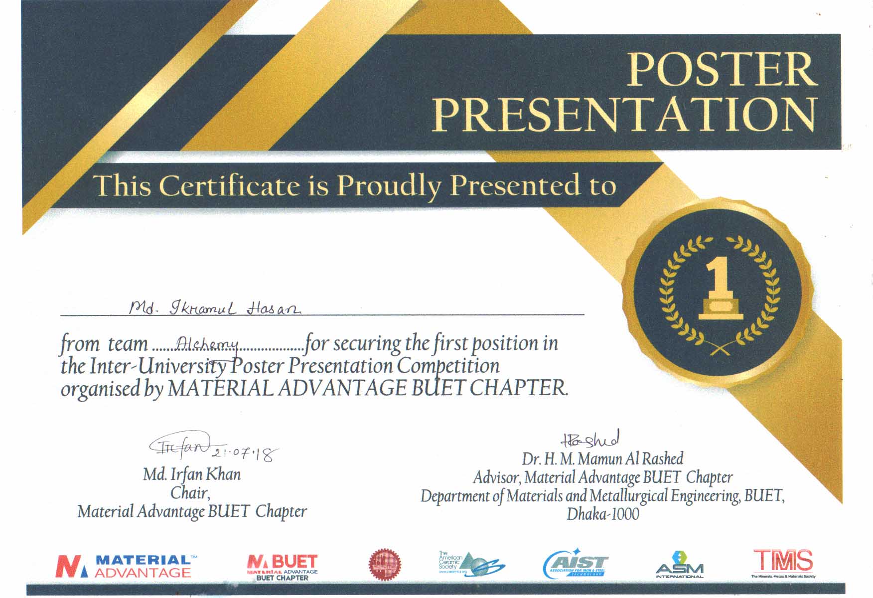 Our Team-‘ Alchemy’ became Champion in Inter University Poster Competition-2018 organized by Material Advantage BUET Chapter. Our idea was to design of bifunctional catalyst from waste material for fuel cell and metal-air battery. We have been awarded 30,000 taka for becoming champion.