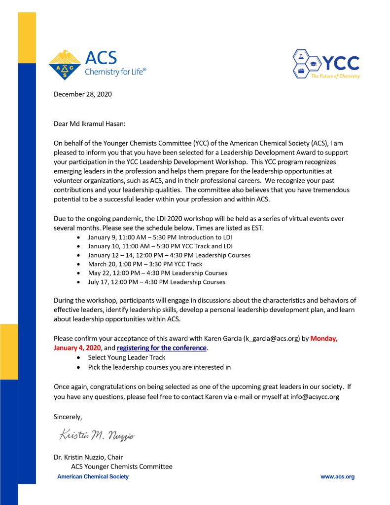 I have been awarded ACS Younger Chemists Committee Leadership Development Award to attend ACS Leadership Development Institute 2021.